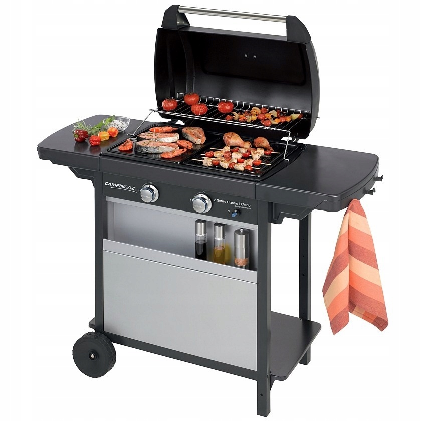 Kontaktný plynový gril s dvomi plochými horákmi z ocele, umožňujúcimi nezávislé grilovanie len na polovici alebo na celej ploche grilu rozdelené na rošt a platňu. Pomocou ovládacích gombíkov možno pohodlne regulovať teplotu teplomeru. Obsahuje plechový kryt s priehradkou na korenie a grilovacie prísady a tiež priestor na uskladnenie plynovej fľaše. Vyklápací rošt pre pozvoľné grilovanie alebo ohrievanie.