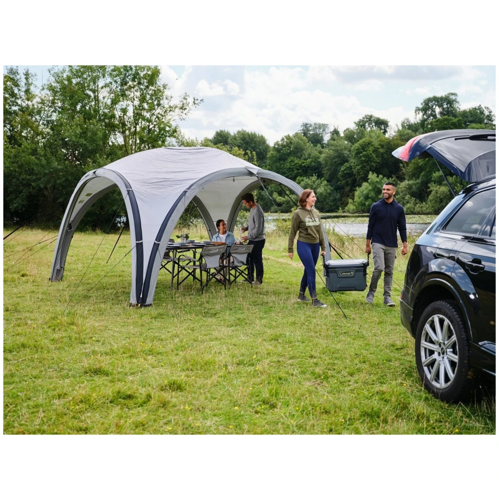 Prístrešok Coleman Air Event Shelter L je priestranný nafukovací altánok vhodný na kempovanie, rodinné výlety, festivaly alebo záhradné podujatia. Vďaka vzduchovej konštrukcii sa prístrešok stavia veľmi rýchlo – celý rám je možné nafúknuť pomocou jedného ventilu, čo výrazne zjednodušuje a zrýchľuje montáž. Vyvinuli sme ďalší bezpečnostný prvok, ktorý umožňuje rovnomerné rozloženie prúdu vzduchu medzi jednotlivé vzduchové valce.