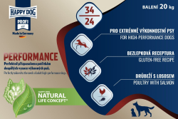 Bezlepkové základné kompletné krmivo Happy Dog Profi Gold Performance 34-24 s cennými ingredienciami z bavorskej prírody vám ponúka na živiny veľmi bohatú výživu s vysokým obsahom stavebných bielkovín a pohotovej energie pre pokrytie vysokých živinových nárokov citlivých. Vysoké množstvo bielkovín (94% živočíšnych bielkovín) zaisťuje dostatočnú tvorbu výkonného telesného svalstva a pre obnovu spotrebovaných krvných bielkovín. Vysoko kvalitné živočíšne a rastlinné tuky dodávajú pohotovú a zásobnú energiu potrebnú na ťažkú svalovú prácu. Chrumkavé granuly prinášajú vysoko kvalitné stavebné bielkoviny z hovädzieho mäsa, lahodnej hydiny a chutných rýb a neobsahujú obilniny, iba ľahko stráviteľnú a dobre znášanlivú ryžu s cennými sacharidmi. Veľmi vysoká koncentrácia živín poskytuje už v malom objeme krmiva dostatočný a rýchly prísun bielkovín a tukov, tým zaťažuje tráviace ústrojenstvo len minimálnou mierou. Receptúra je navyše zušľachtená prídavkom jedinečného Happy Dog Natural Life Concept®, ktorý poskytuje vášmu atlétovi mnoho cenných prírodných živín pre imunitu a celkové zdravie a je obohatená aj o cenné novozélandské morské mušle (Slávka pyskatá) na podporu kĺbov. Krmivo preto možno nasadiť u všetkých citlivých pracovných a športových psov s potravinovou neznášanlivosťou obilia v období ich enormne zvýšenej fyzickej záťaže.