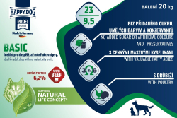 Zároveň je krmivo pre psov Basic vhodné aj pre psích seniorov. Krmivo dodáva nevyhnutné minerály, stopové prvky a vitamíny. Krmivo Happy Dog BASIC (proteín 23 %, tuk 9,5 %) prináša striedmy obsah živín - nedochádza k zbytočnému prekrmovaniu psov a zbytočnému zaťaženiu vnútorných orgánov.
