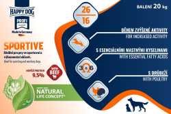 Ideálne krmivo pre pracovné a športové psy so strednou telesnou záťažou. Zároveň je krmivo pre psov Sportive vhodné aj pre gravidné a dojčiace sučky. Energeticky bohatšie krmivo Happy Dog SPORTIVE (proteín 26 %, tuk 16 %) prináša väčší podiel stavebných bielkovín a viac energie pre pokrytie mierne zvýšených živinových nárokov pracovných, športových alebo chovných psov v období ich zvýšenej aktivity. Krmivo je možné nasadiť aj pri odchove aktívnych mladých psov stredných a veľkých plemien, ktorí sú už zaradení do aktívneho výcviku a tréningu. Krmivo obsahuje všetky potrebné minerálne látky, stopové prvky a vitamíny v pomeroch optimalizovaných pre stredne zaťažené psy. Zdravá výživa pre psov, u ktorých sú kladené vyššie nároky na prísun všetkých živín.